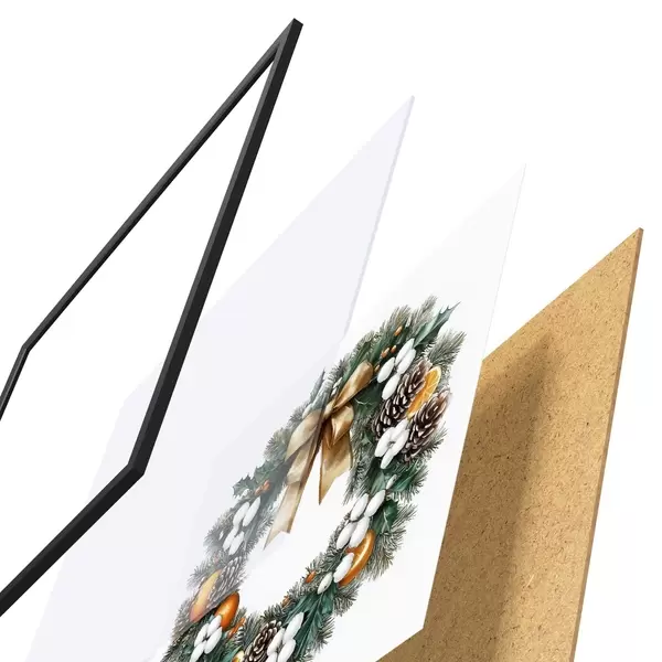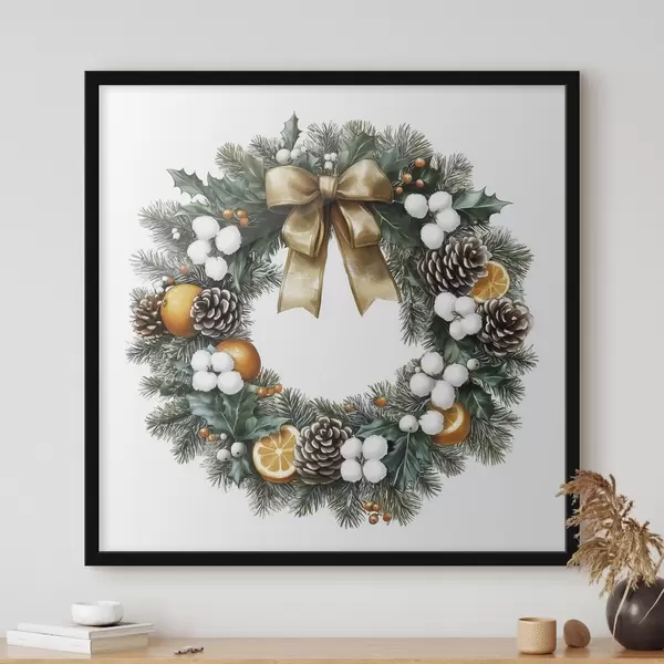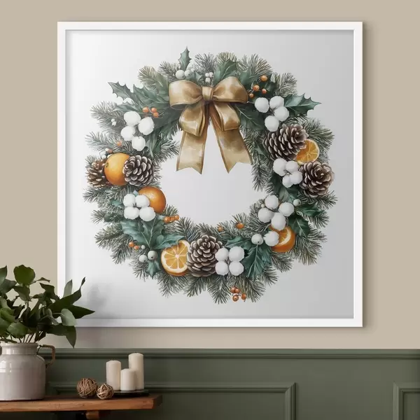 Poster Kerstboomkrans met strik, katoen, sinaasappels, bessen en dennenappels Nr f41962