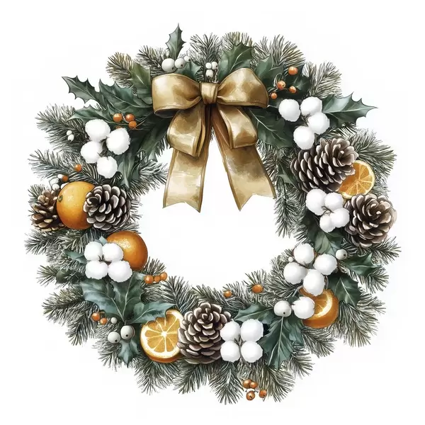 Poster Kerstboomkrans met strik, katoen, sinaasappels, bessen en dennenappels Nr f41962