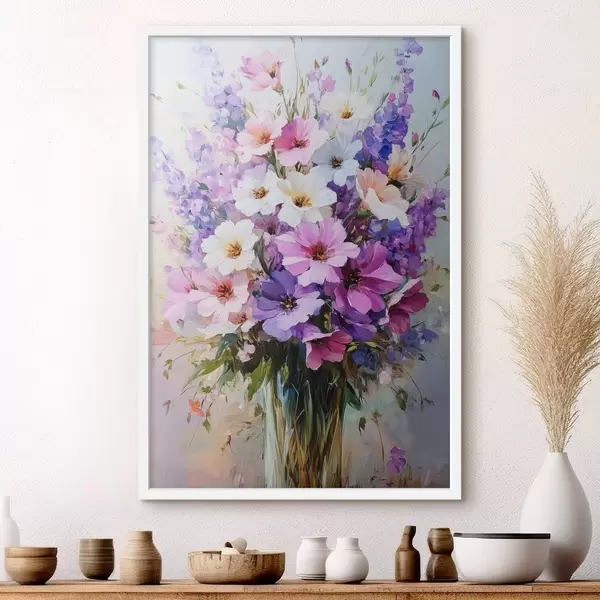 Poster paarse en witte bloemen in een vaas Nr f41999