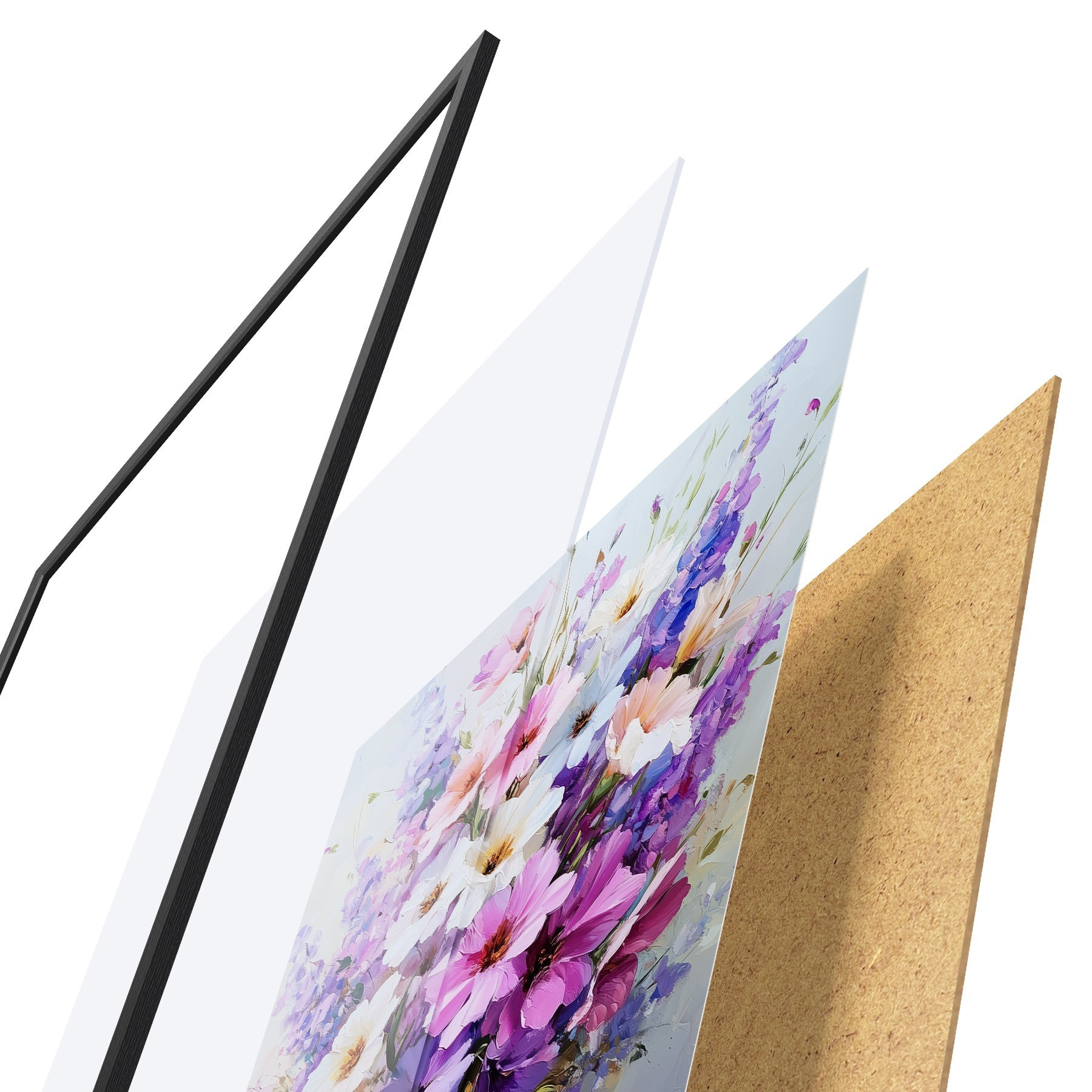 De poster bestaat uit een frame, plexiglas, geprinte afbeelding en spaanplaat achterkant. De poster kan meteen aan de muur worden gehangen dankzij de bevestigingen op de achterkant.
