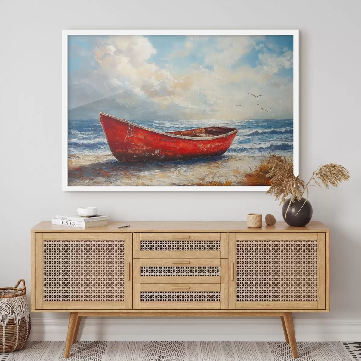 Poster rode boot aan zee in olieverfstijl Nr f42009
