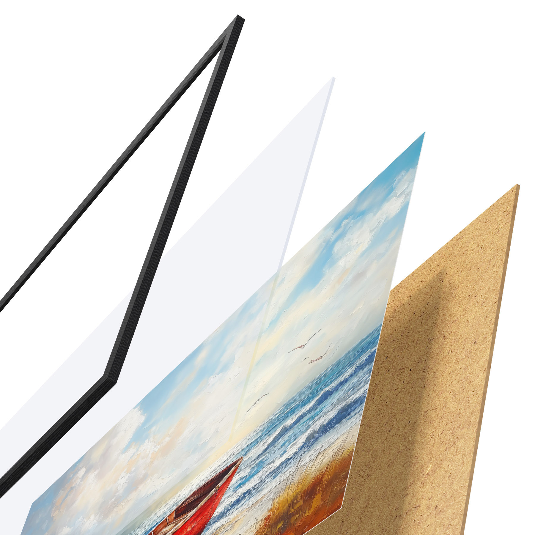 De poster bestaat uit een frame, plexiglas, geprinte afbeelding en spaanplaat achterkant. De poster kan meteen aan de muur worden gehangen dankzij de bevestigingen op de achterkant.