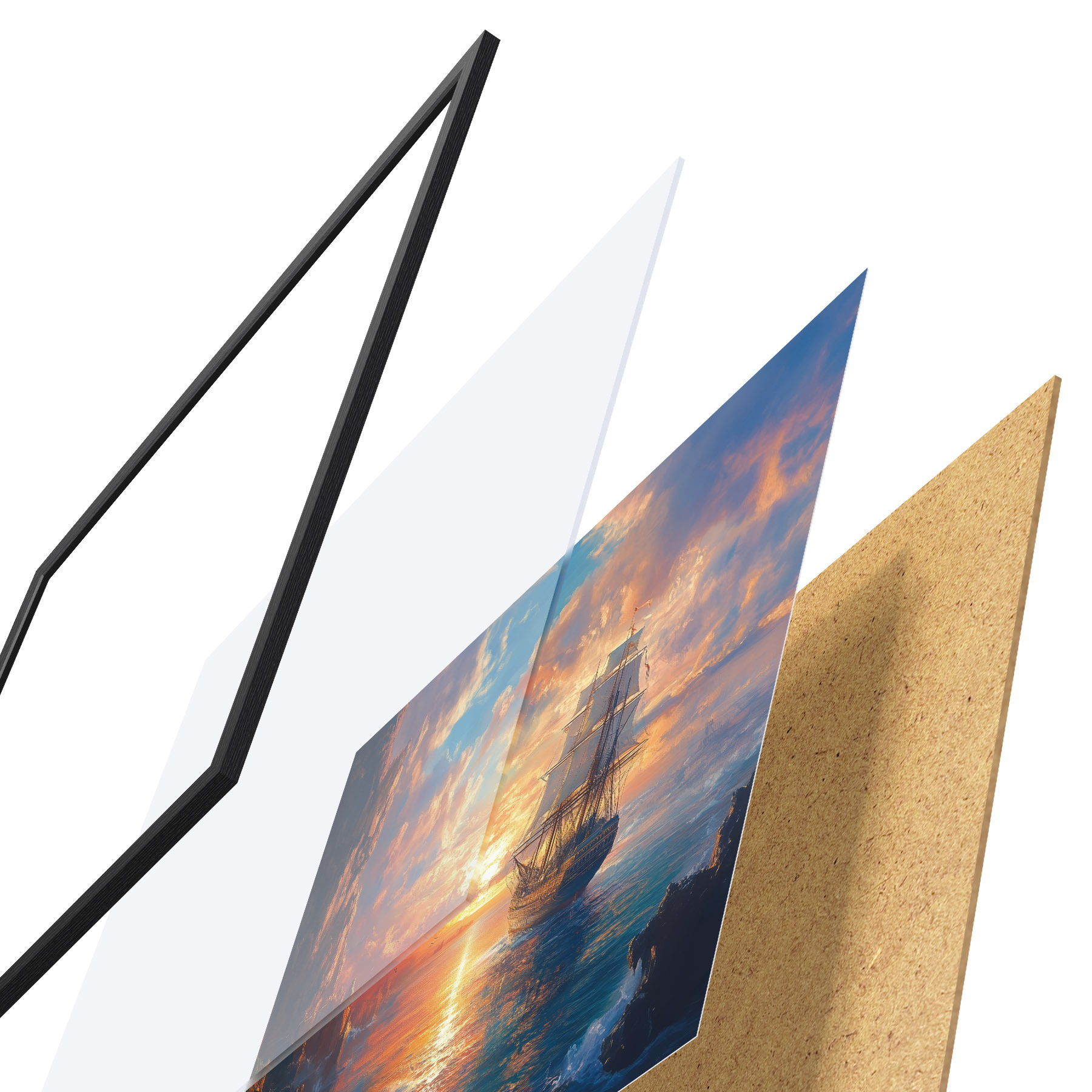 De poster bestaat uit een frame, plexiglas, geprinte afbeelding en spaanplaat achterkant. De poster kan meteen aan de muur worden gehangen dankzij de bevestigingen op de achterkant.