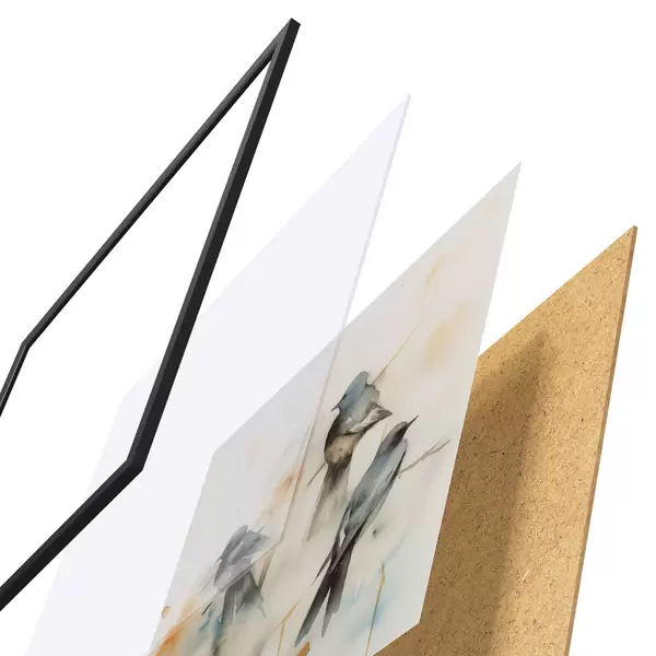 De poster bestaat uit een frame, plexiglas, geprinte afbeelding en spaanplaat achterkant. De poster kan meteen aan de muur worden gehangen dankzij de bevestigingen op de achterkant.