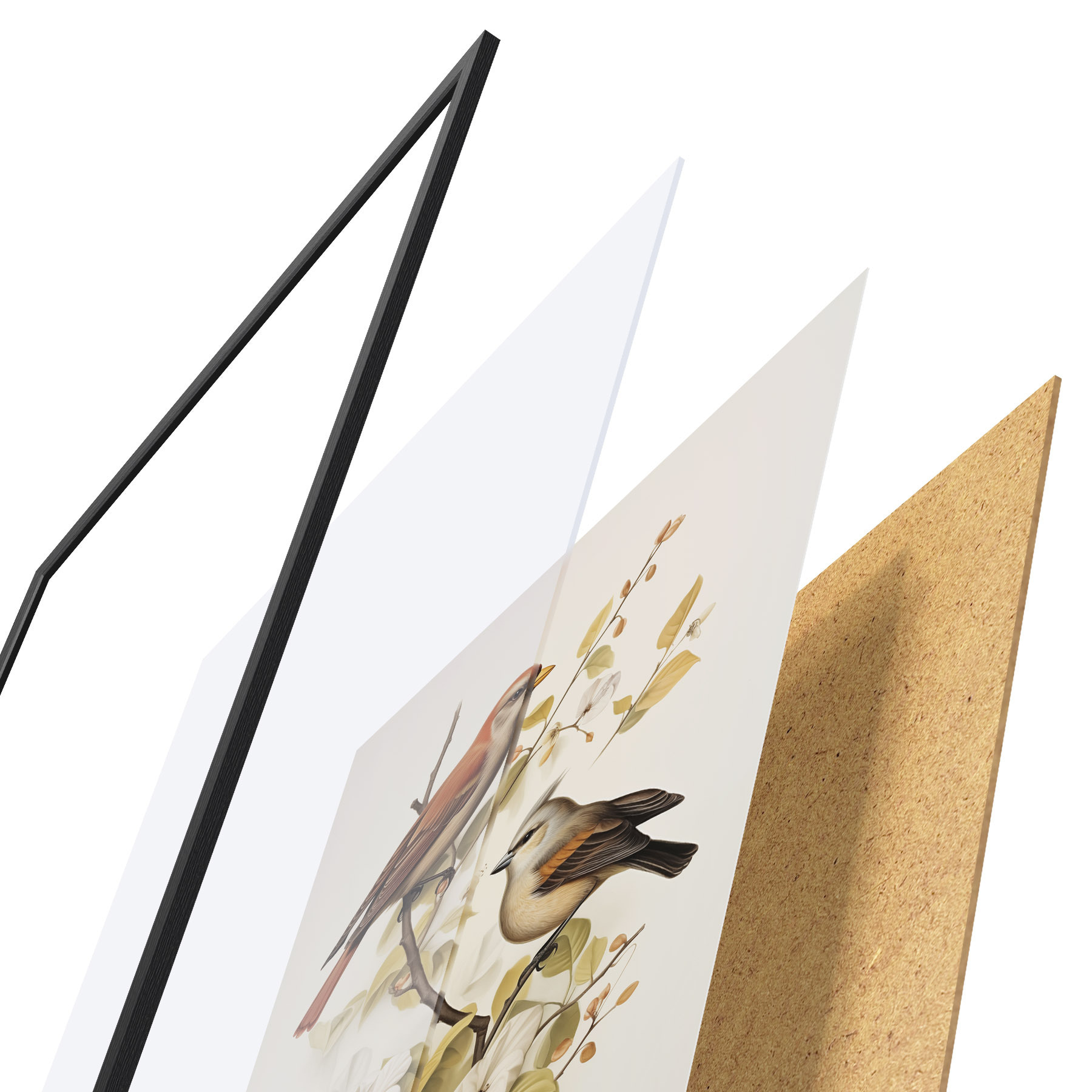 De poster bestaat uit een frame, plexiglas, geprinte afbeelding en spaanplaat achterkant. De poster kan meteen aan de muur worden gehangen dankzij de bevestigingen op de achterkant.