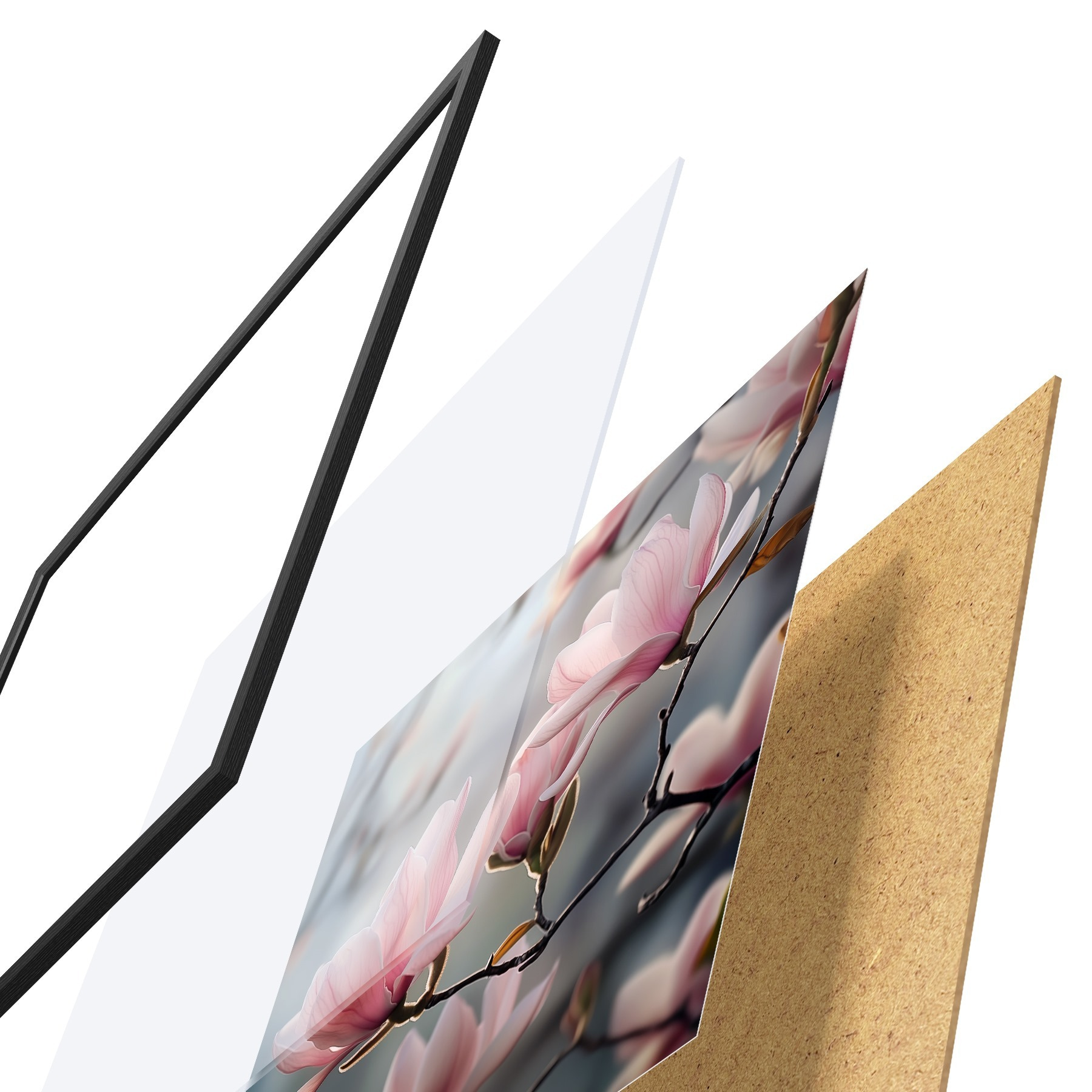De poster bestaat uit een frame, plexiglas, geprinte afbeelding en spaanplaat achterkant. De poster kan meteen aan de muur worden gehangen dankzij de bevestigingen op de achterkant.