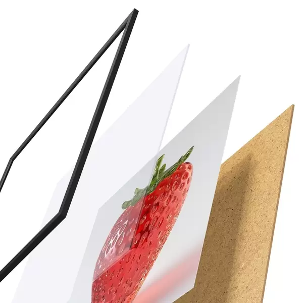 De poster bestaat uit een frame, plexiglas, geprinte afbeelding en spaanplaat achterkant. De poster kan meteen aan de muur worden gehangen dankzij de bevestigingen op de achterkant.