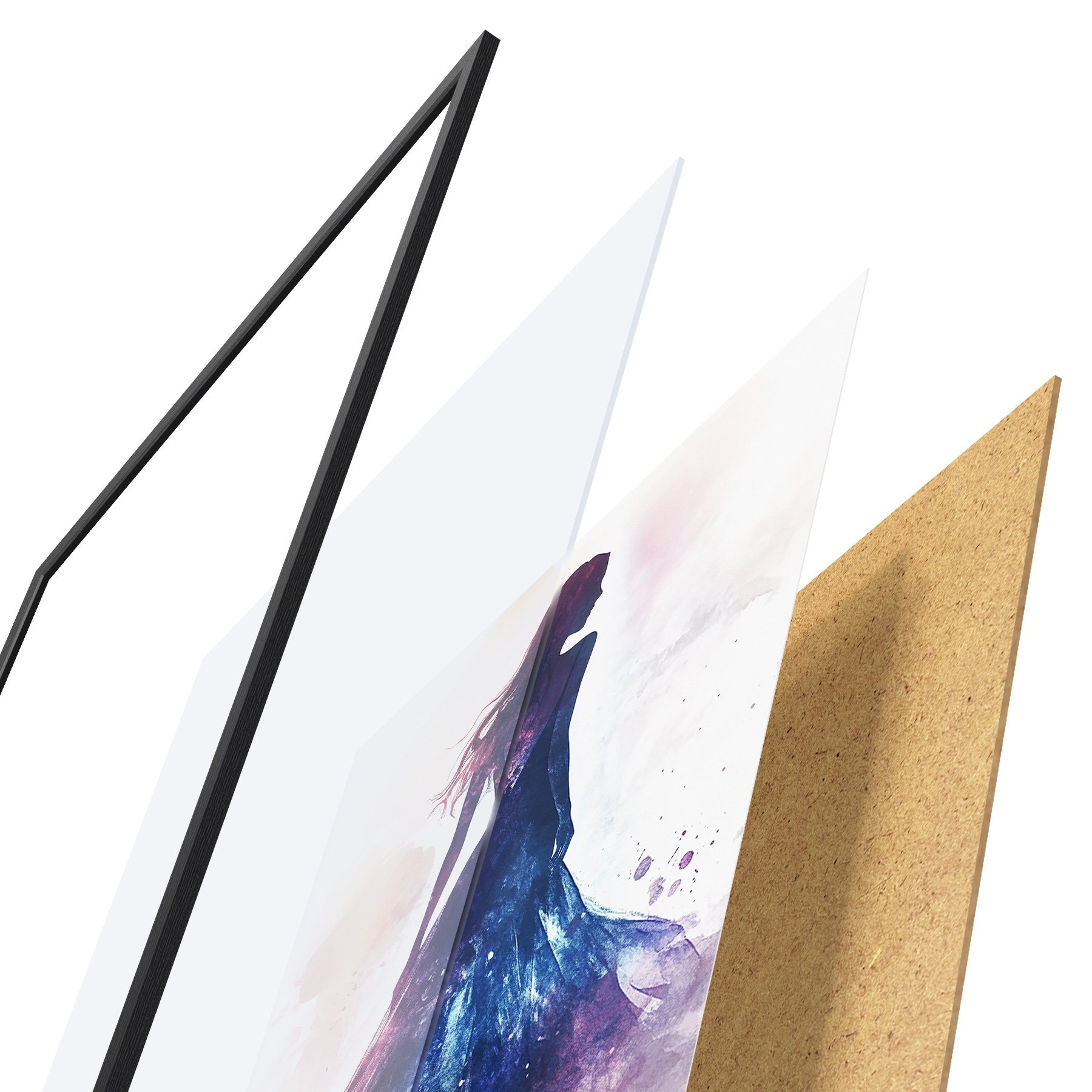 De poster bestaat uit een frame, plexiglas, geprinte afbeelding en spaanplaat achterkant. De poster kan meteen aan de muur worden gehangen dankzij de bevestigingen op de achterkant.