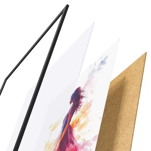 De poster bestaat uit een frame, plexiglas, geprinte afbeelding en spaanplaat achterkant. De poster kan meteen aan de muur worden gehangen dankzij de bevestigingen op de achterkant.