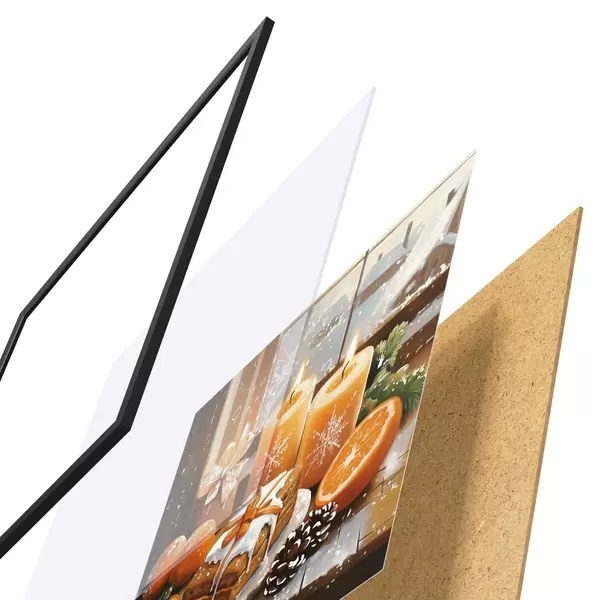 De poster bestaat uit een frame, plexiglas, geprinte afbeelding en spaanplaat achterkant. De poster kan meteen aan de muur worden gehangen dankzij de bevestigingen op de achterkant.