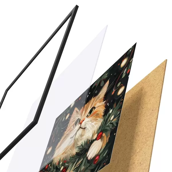 De poster bestaat uit een frame, plexiglas, geprinte afbeelding en spaanplaat achterkant. De poster kan meteen aan de muur worden gehangen dankzij de bevestigingen op de achterkant.