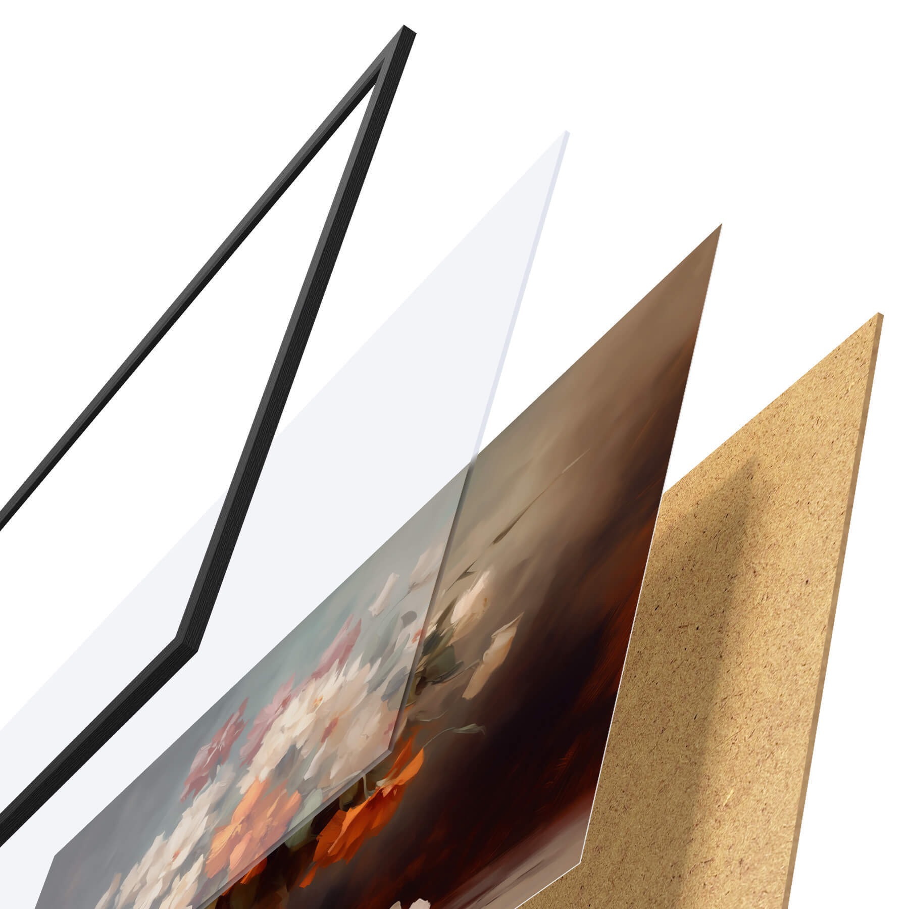De poster bestaat uit een frame, plexiglas, geprinte afbeelding en spaanplaat achterkant. De poster kan meteen aan de muur worden gehangen dankzij de bevestigingen op de achterkant.