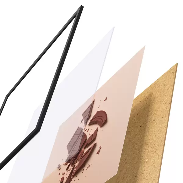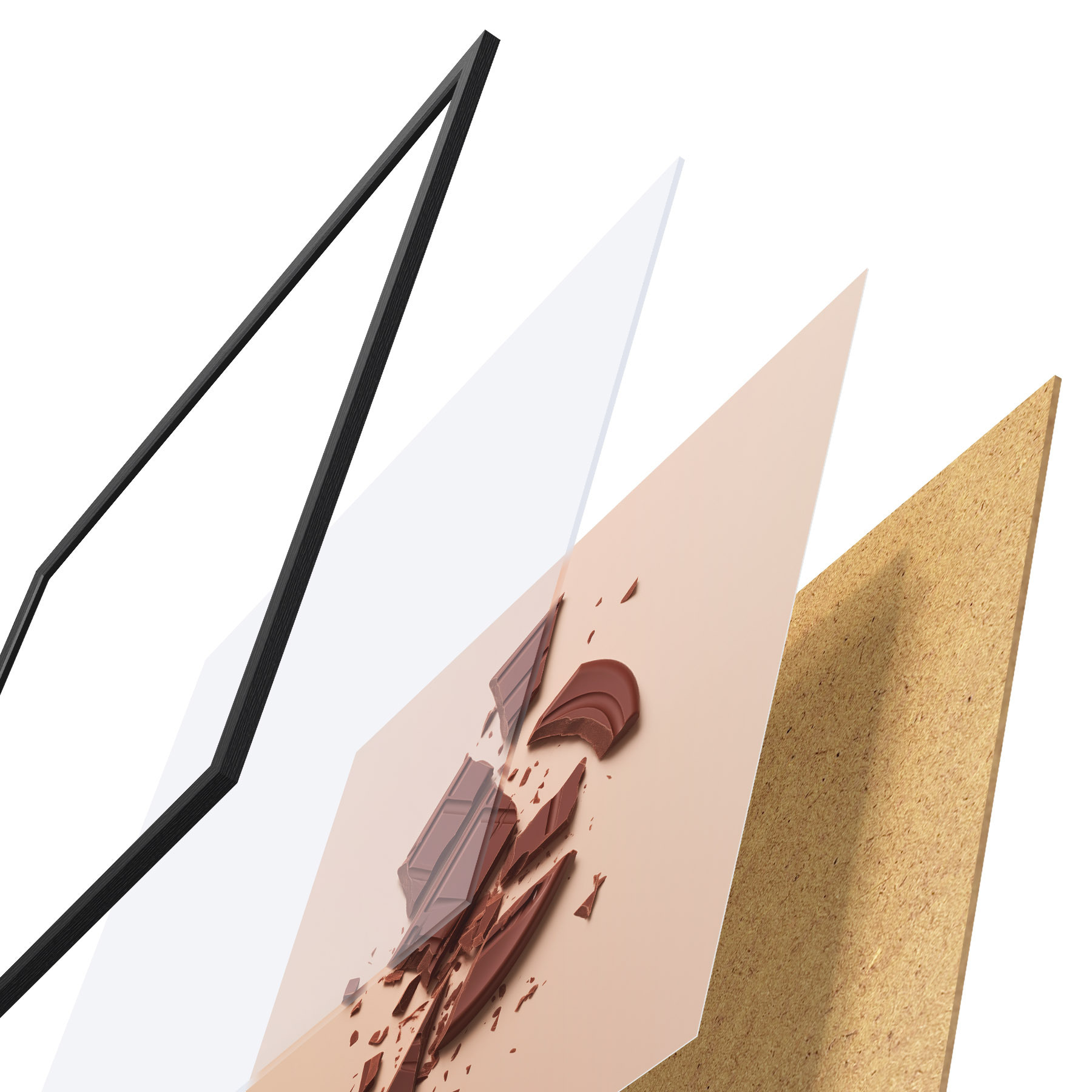 De poster bestaat uit een frame, plexiglas, geprinte afbeelding en spaanplaat achterkant. De poster kan meteen aan de muur worden gehangen dankzij de bevestigingen op de achterkant.