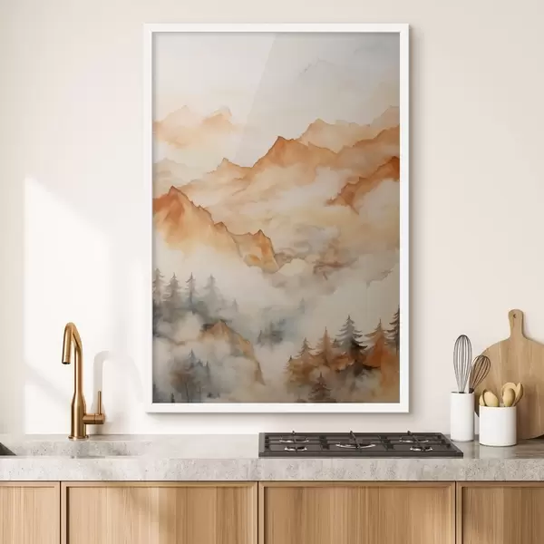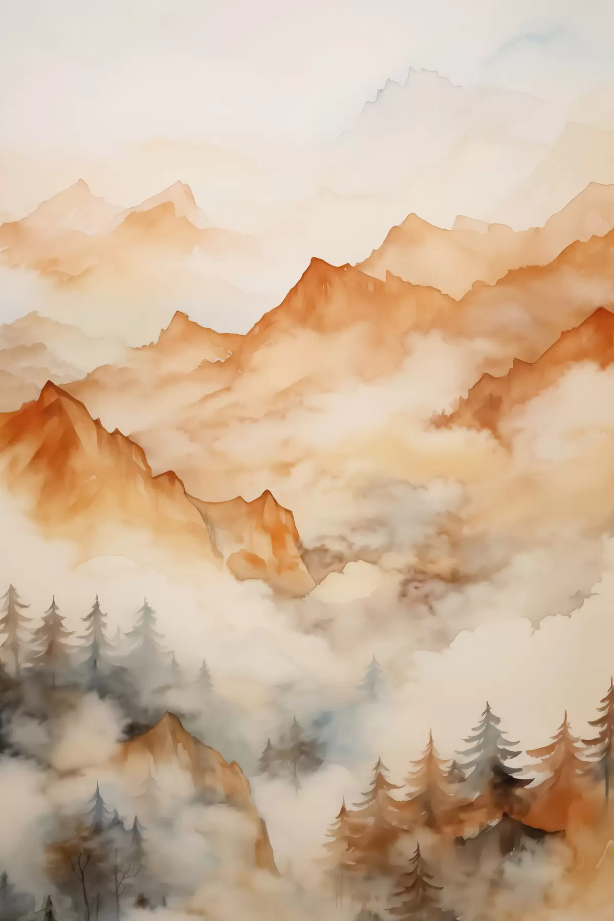 Poster Bos en bergen imitatie van aquarel, oranje tinten Nr f42119