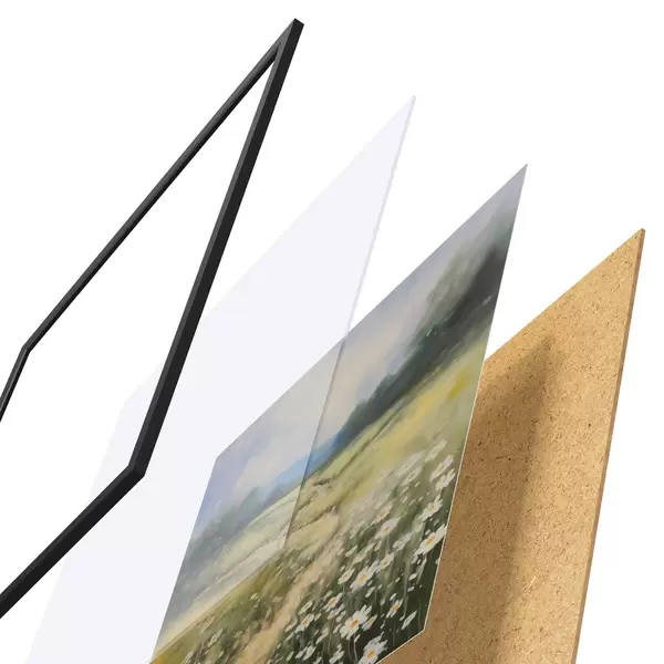 De poster bestaat uit een frame, plexiglas, geprinte afbeelding en spaanplaat achterkant. De poster kan meteen aan de muur worden gehangen dankzij de bevestigingen op de achterkant.