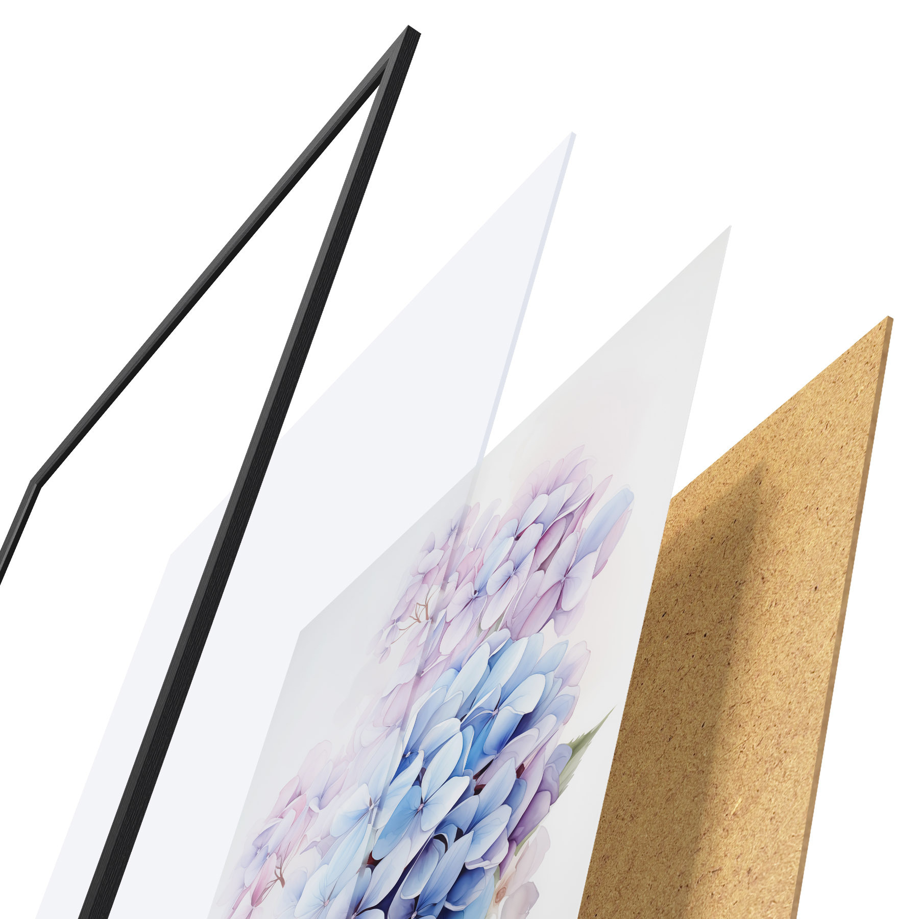 De poster bestaat uit een frame, plexiglas, geprinte afbeelding en spaanplaat achterkant. De poster kan meteen aan de muur worden gehangen dankzij de bevestigingen op de achterkant.