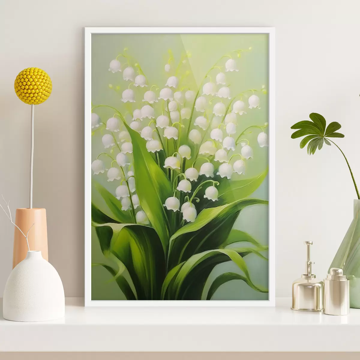 Poster Lelietjes-van-dalen op een delicate groene achtergrond f42160