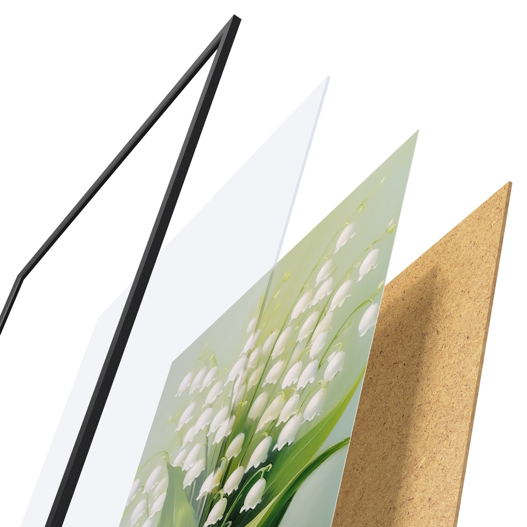 De poster bestaat uit een frame, plexiglas, geprinte afbeelding en spaanplaat achterkant. De poster kan meteen aan de muur worden gehangen dankzij de bevestigingen op de achterkant.