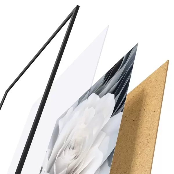 De poster bestaat uit een frame, plexiglas, geprinte afbeelding en spaanplaat achterkant. De poster kan meteen aan de muur worden gehangen dankzij de bevestigingen op de achterkant.