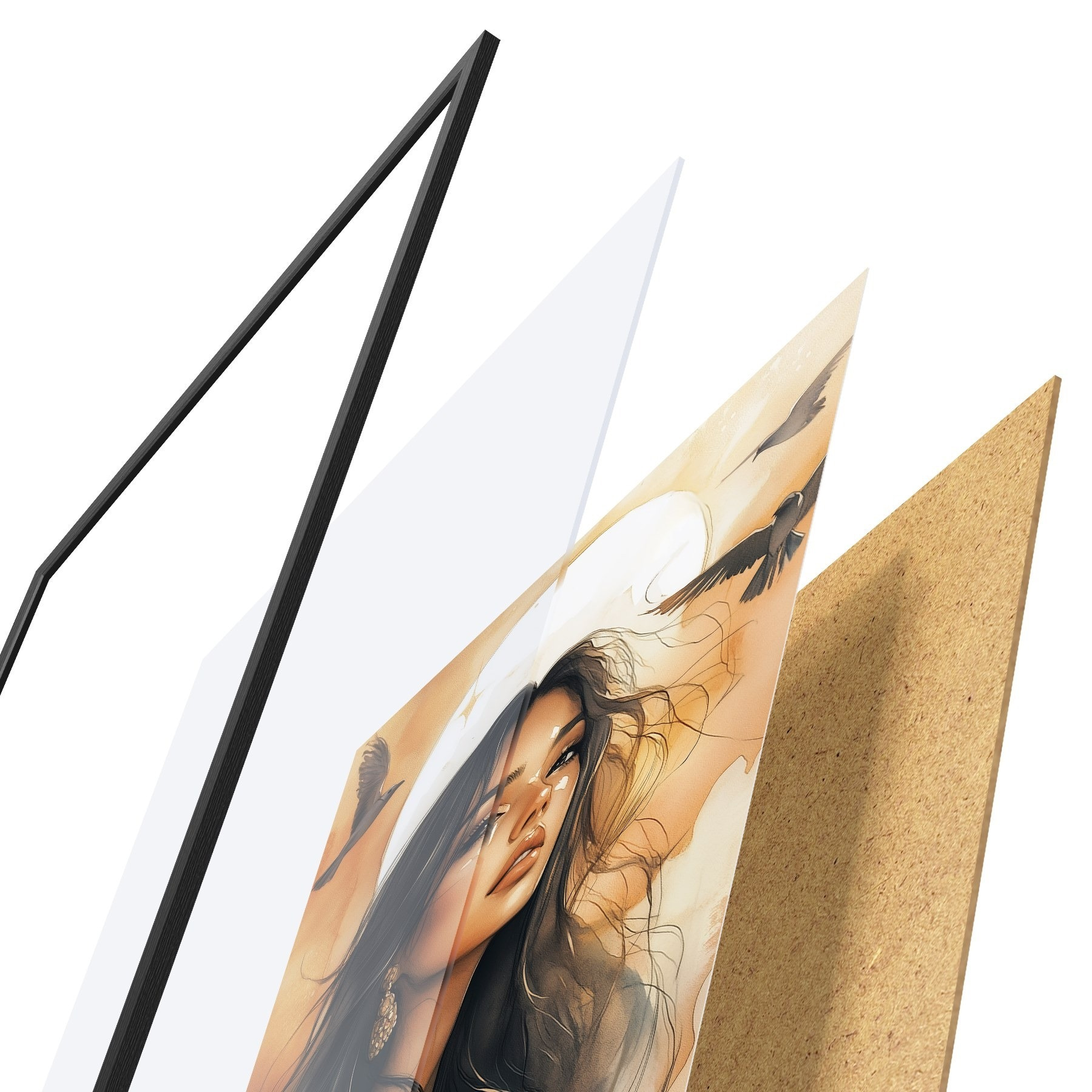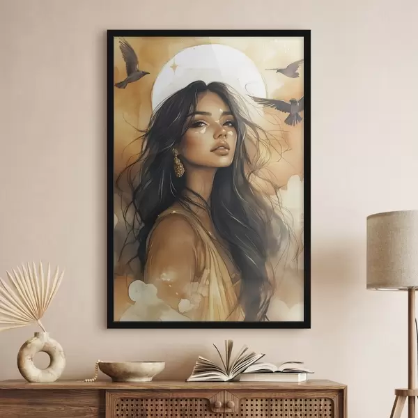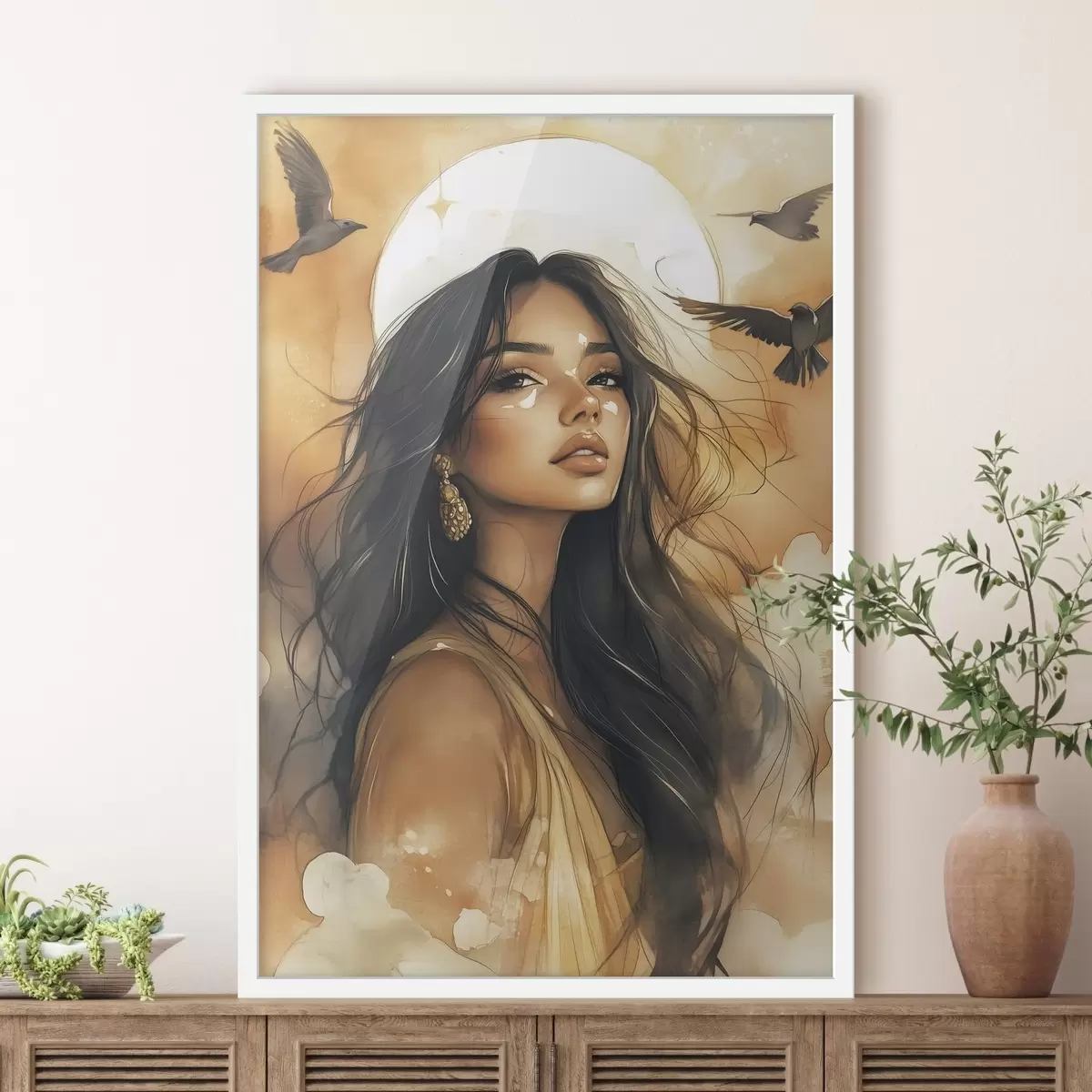 Poster Vrouw met vliegende vogels, tribal, beige kleuren, zon Nr f42196
