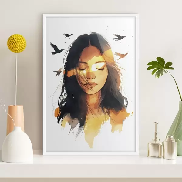 Poster Aquarel stijl portret, mooi meisje, zonlicht, vliegende vogels Nr f42198