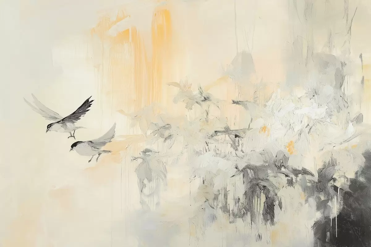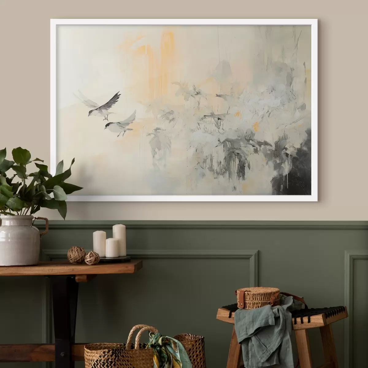 Poster Abstractie met vogels, acrylstijl, grijze en beige kleuren Nr f42206