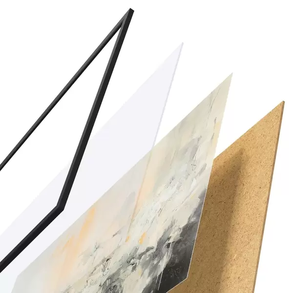 De poster bestaat uit een frame, plexiglas, geprinte afbeelding en spaanplaat achterkant. De poster kan meteen aan de muur worden gehangen dankzij de bevestigingen op de achterkant.