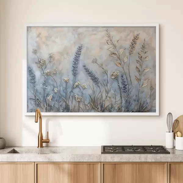 Poster Een veld met verschillende wilde bloemen en planten in blauw-, wit- en beigetinten tegen een zachte, wazige achtergrond Nr f42214