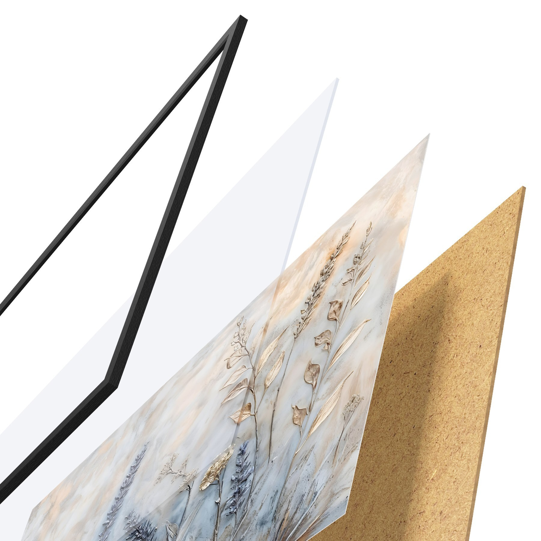 Poster Een veld met verschillende wilde bloemen en planten in blauw-, wit- en beigetinten tegen een zachte, wazige achtergrond f42214