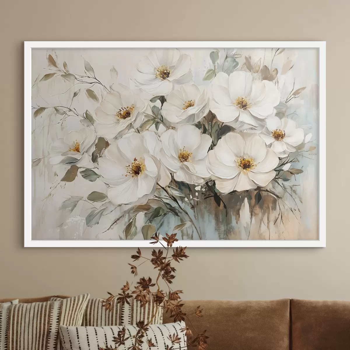 Poster Een boeket grote witte bloemen in olieverfstijl met gele harten tegen een lichte achtergrond Nr f42222