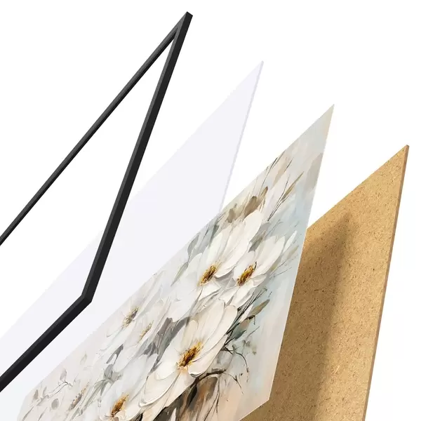 De poster bestaat uit een frame, plexiglas, geprinte afbeelding en spaanplaat achterkant. De poster kan meteen aan de muur worden gehangen dankzij de bevestigingen op de achterkant.