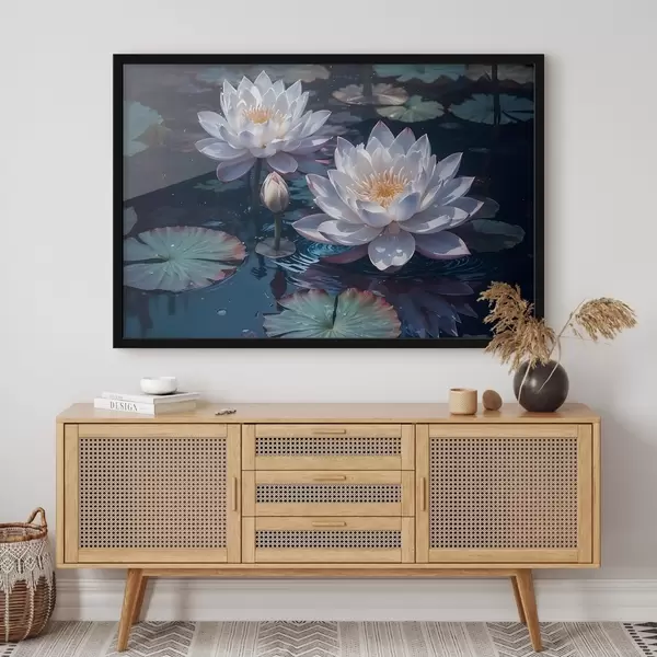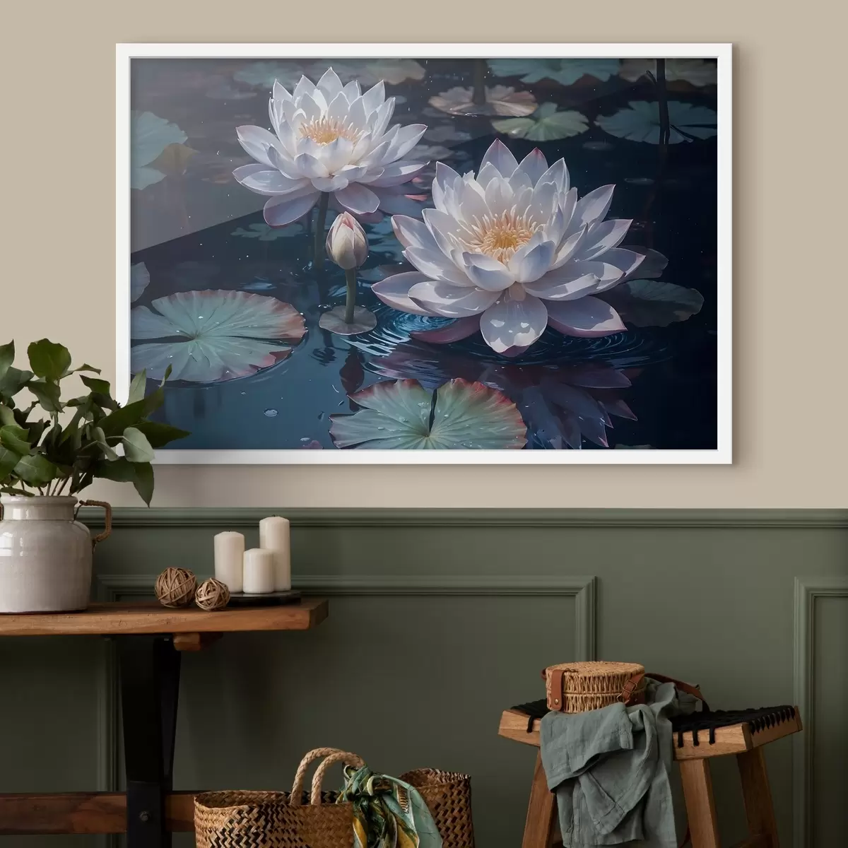 Poster Witte lotusbloemen drijvend op een kalme vijver met lelieblad f42225