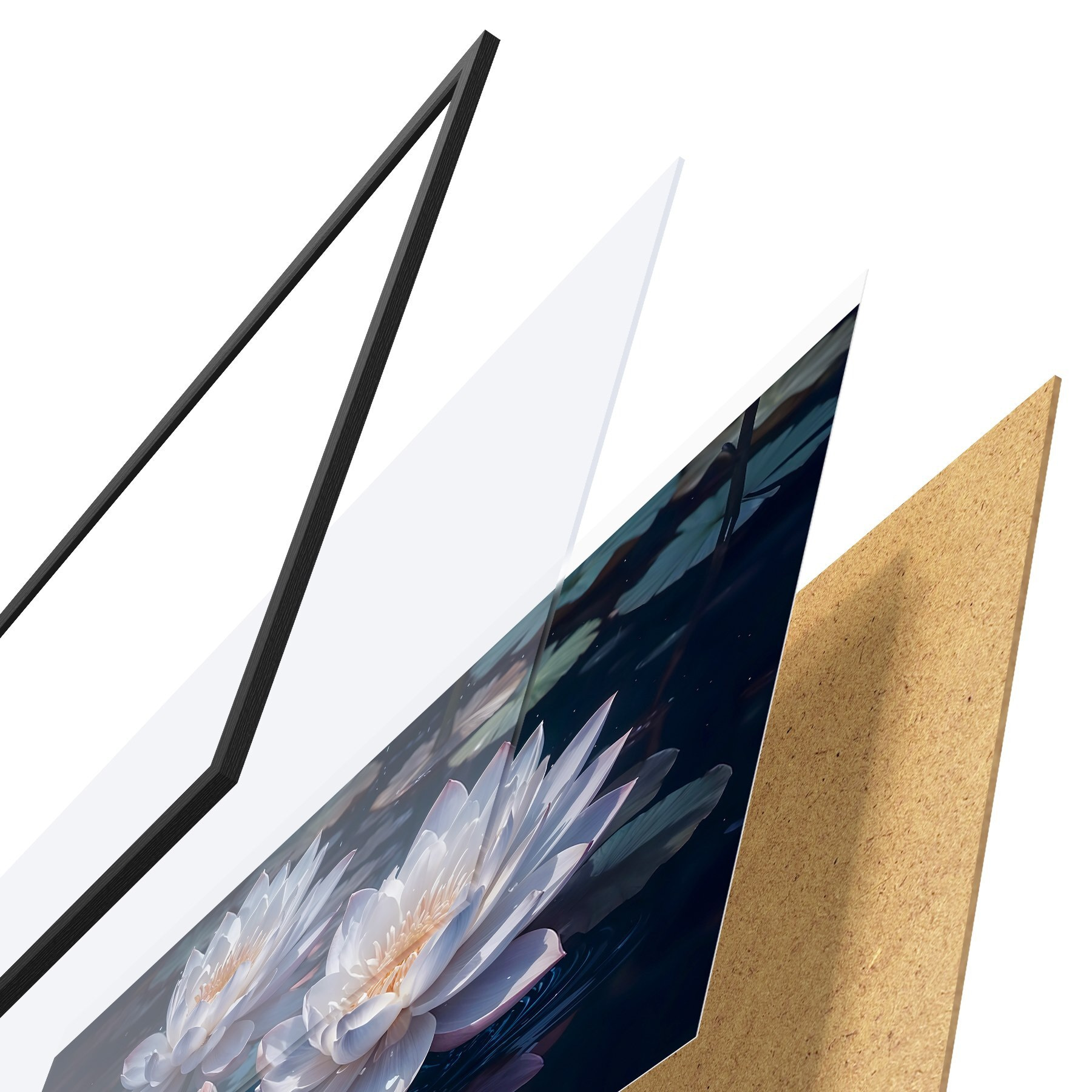 De poster bestaat uit een frame, plexiglas, geprinte afbeelding en spaanplaat achterkant. De poster kan meteen aan de muur worden gehangen dankzij de bevestigingen op de achterkant.