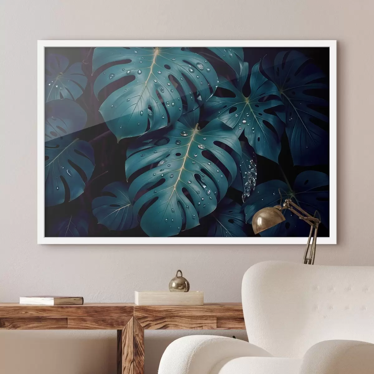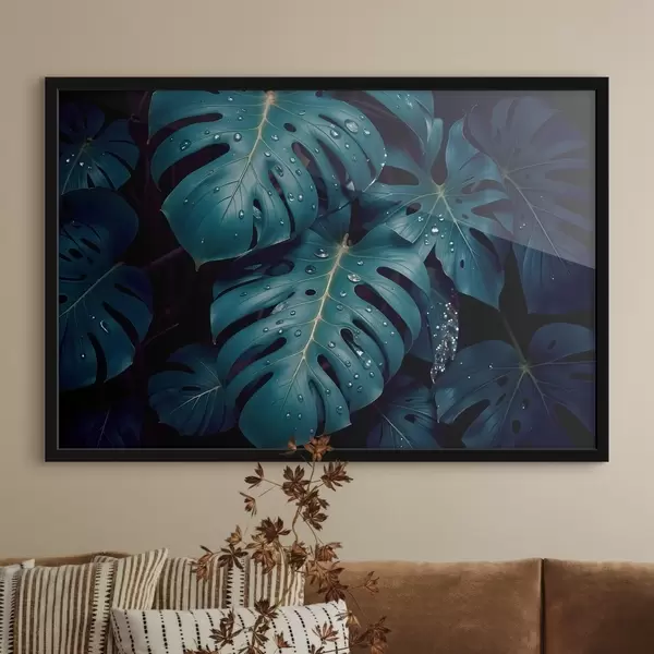 Poster Weelderige tropische monsterabladeren met waterdruppels tegen een donkere achtergrond, waardoor een stemmige en sfeervolle print ontstaat Nr f42233