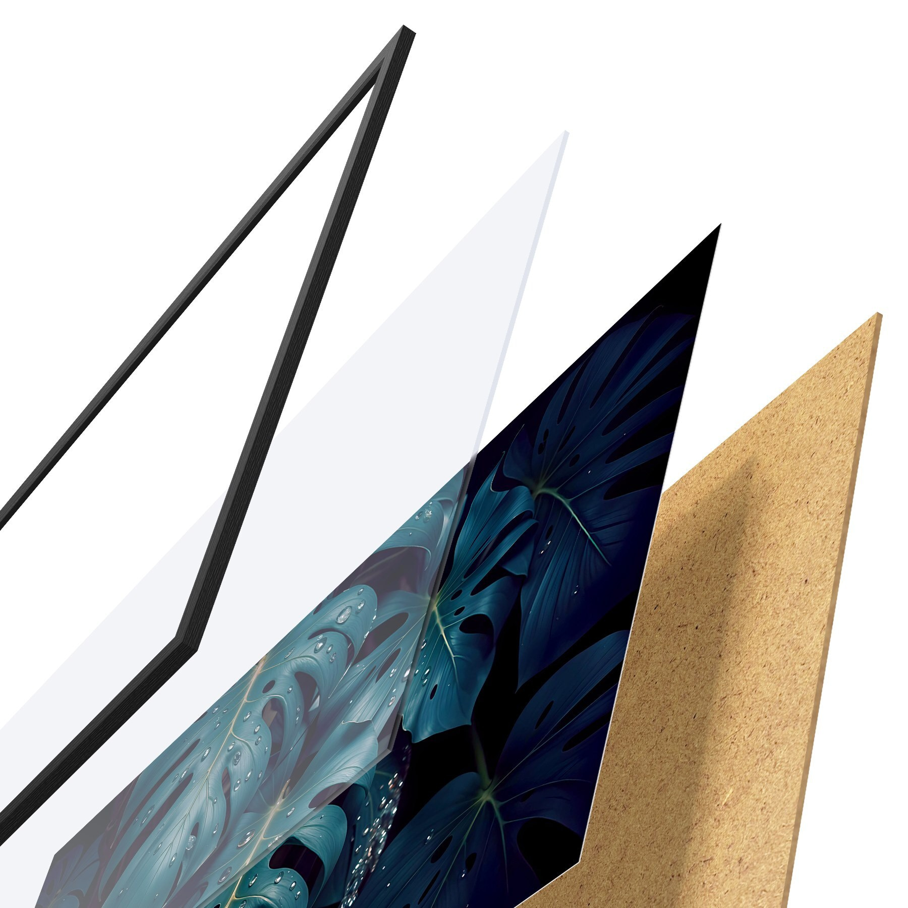 De poster bestaat uit een frame, plexiglas, geprinte afbeelding en spaanplaat achterkant. De poster kan meteen aan de muur worden gehangen dankzij de bevestigingen op de achterkant.