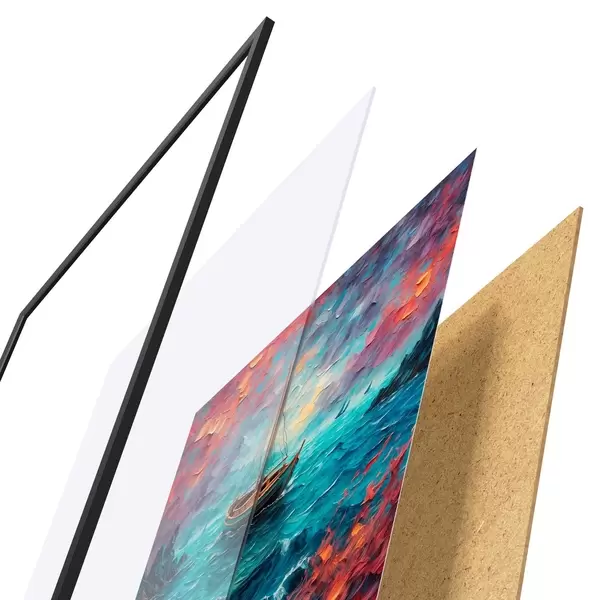 De poster bestaat uit een frame, plexiglas, geprinte afbeelding en spaanplaat achterkant. De poster kan meteen aan de muur worden gehangen dankzij de bevestigingen op de achterkant.