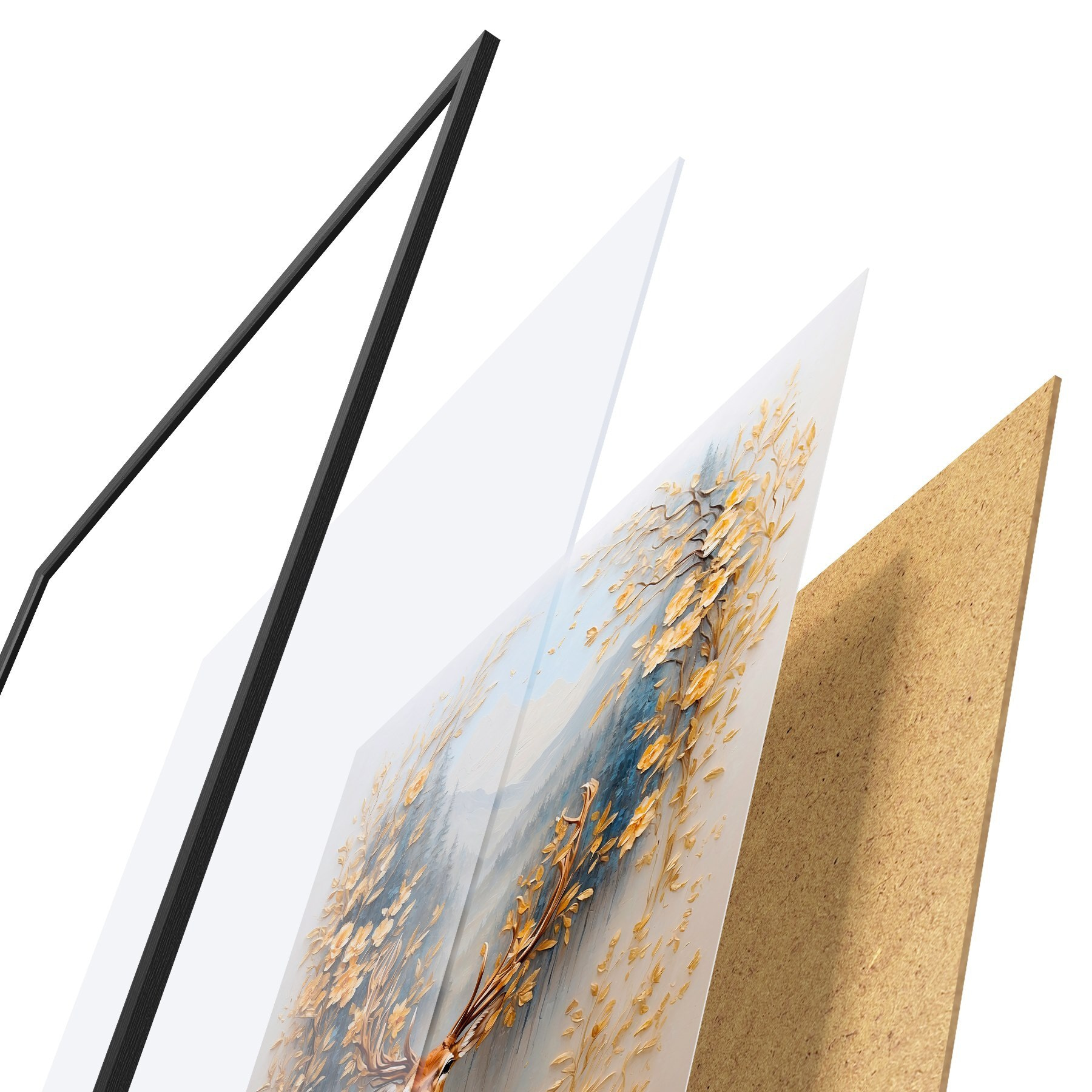 De poster bestaat uit een frame, plexiglas, geprinte afbeelding en spaanplaat achterkant. De poster kan meteen aan de muur worden gehangen dankzij de bevestigingen op de achterkant.