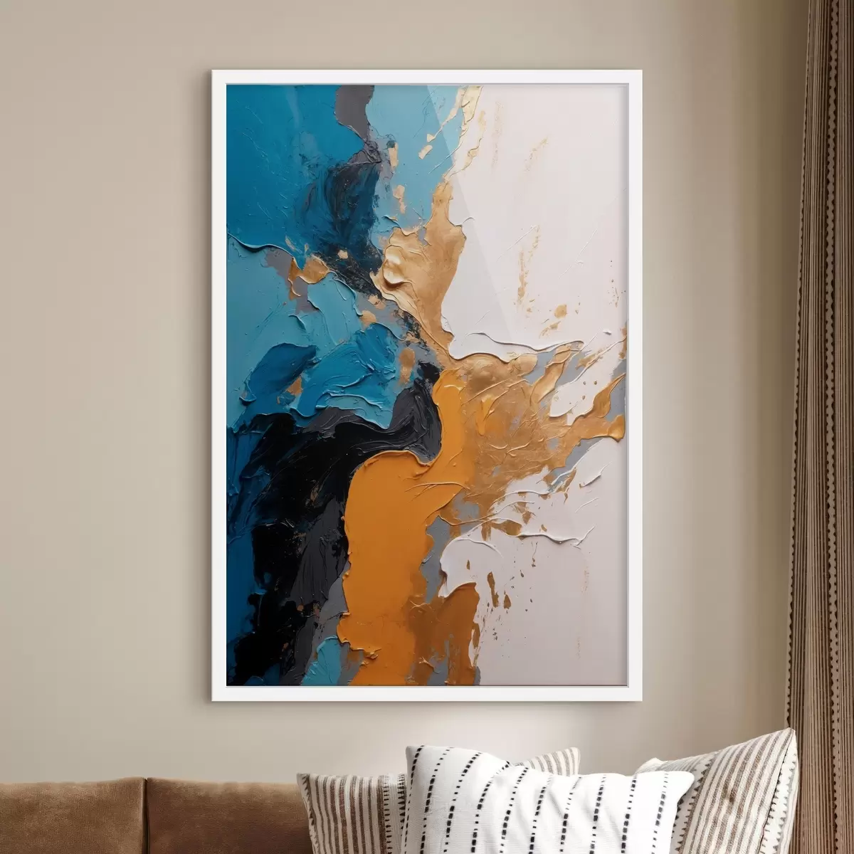 Poster Abstract schilderij met blauwe witte en gele kleuren Nr f42254