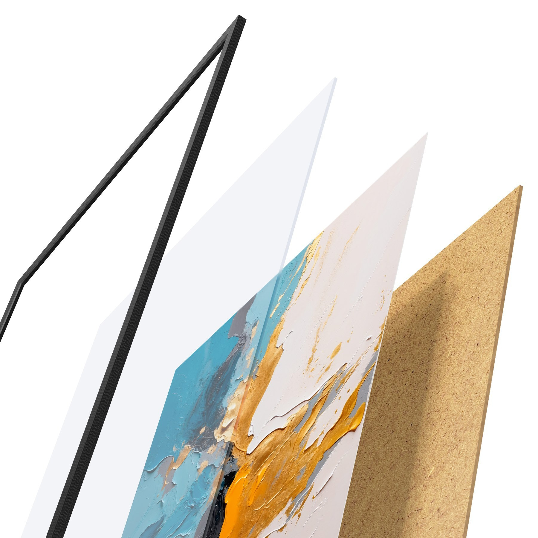 De poster bestaat uit een frame, plexiglas, geprinte afbeelding en spaanplaat achterkant. De poster kan meteen aan de muur worden gehangen dankzij de bevestigingen op de achterkant.