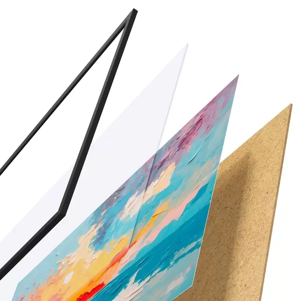 De poster bestaat uit een frame, plexiglas, geprinte afbeelding en spaanplaat achterkant. De poster kan meteen aan de muur worden gehangen dankzij de bevestigingen op de achterkant.