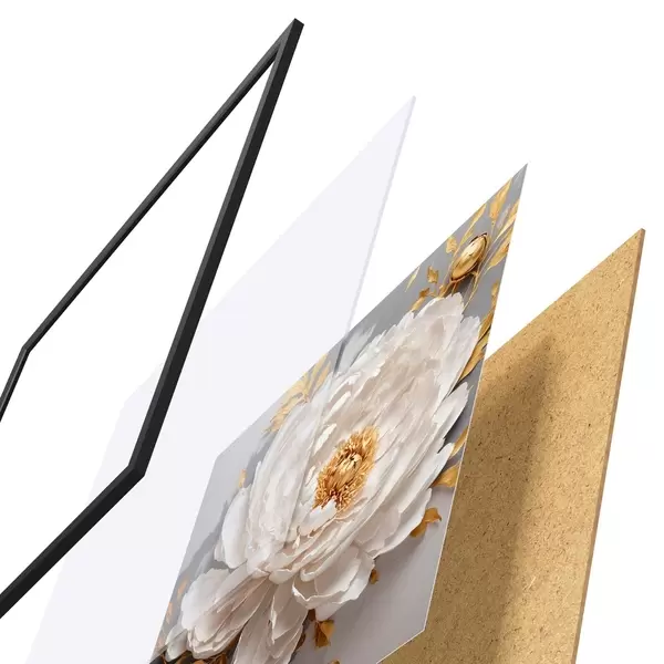 De poster bestaat uit een frame, plexiglas, geprinte afbeelding en spaanplaat achterkant. De poster kan meteen aan de muur worden gehangen dankzij de bevestigingen op de achterkant.