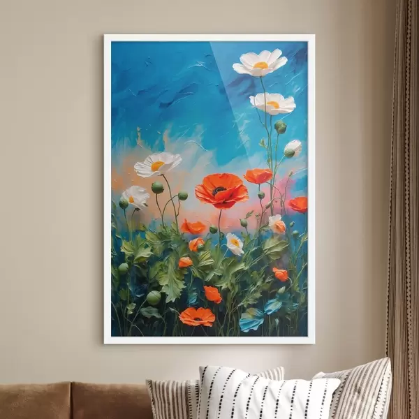 Poster Madeliefjes en klaprozen op blauwe achtergrond f42261