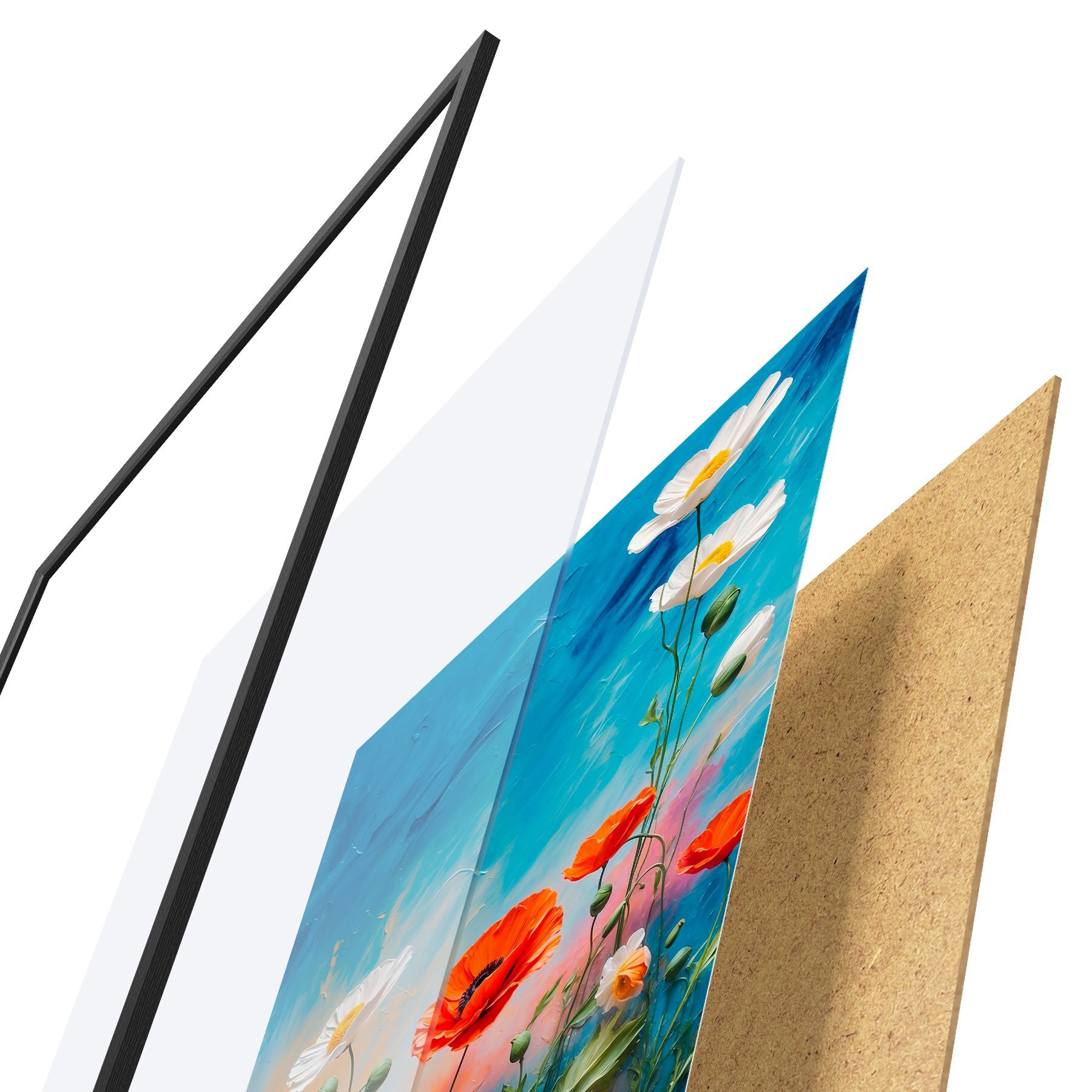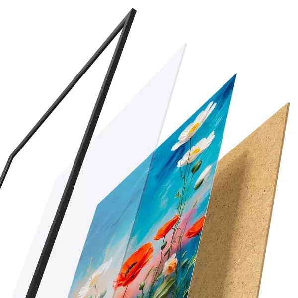 De poster bestaat uit een frame, plexiglas, geprinte afbeelding en spaanplaat achterkant. De poster kan meteen aan de muur worden gehangen dankzij de bevestigingen op de achterkant.