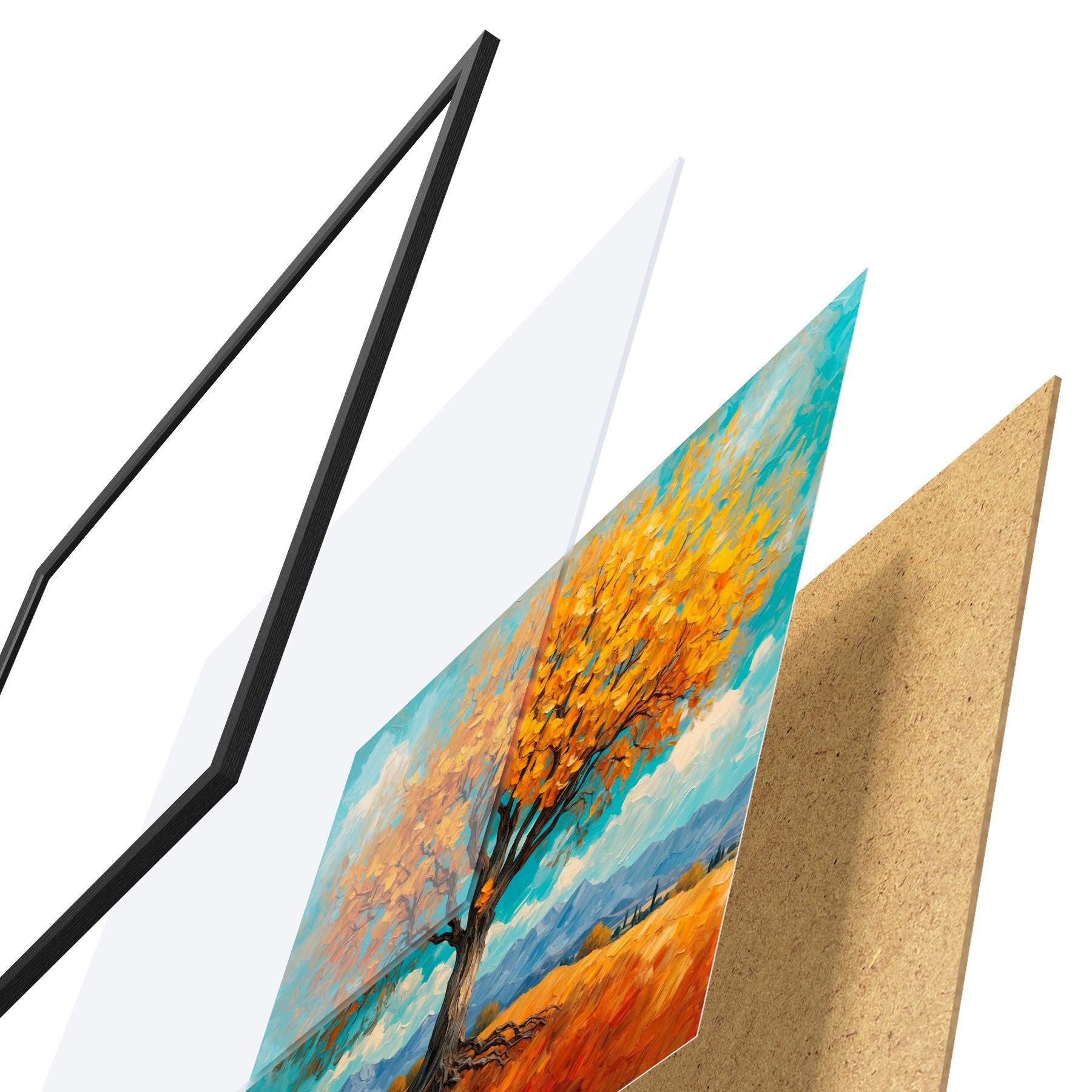 De poster bestaat uit een frame, plexiglas, geprinte afbeelding en spaanplaat achterkant. De poster kan meteen aan de muur worden gehangen dankzij de bevestigingen op de achterkant.