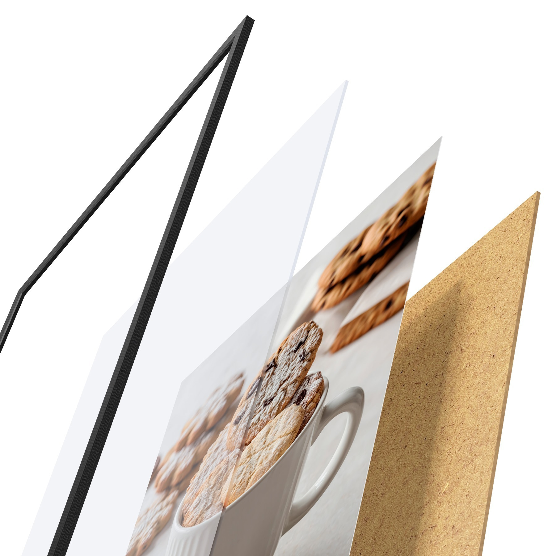 De poster bestaat uit een frame, plexiglas, geprinte afbeelding en spaanplaat achterkant. De poster kan meteen aan de muur worden gehangen dankzij de bevestigingen op de achterkant.