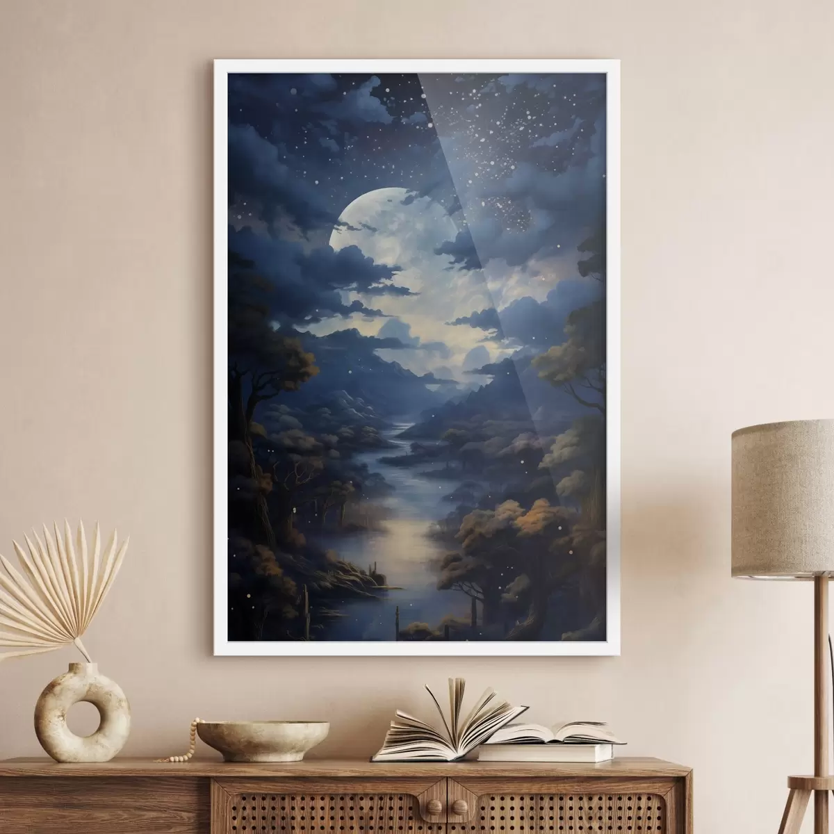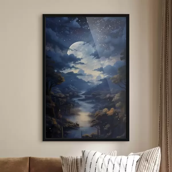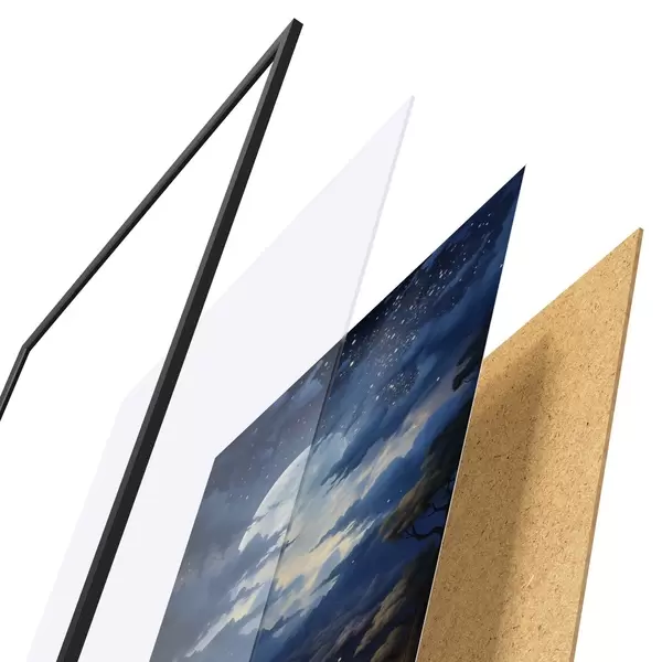 De poster bestaat uit een frame, plexiglas, geprinte afbeelding en spaanplaat achterkant. De poster kan meteen aan de muur worden gehangen dankzij de bevestigingen op de achterkant.