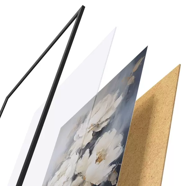 De poster bestaat uit een frame, plexiglas, geprinte afbeelding en spaanplaat achterkant. De poster kan meteen aan de muur worden gehangen dankzij de bevestigingen op de achterkant.