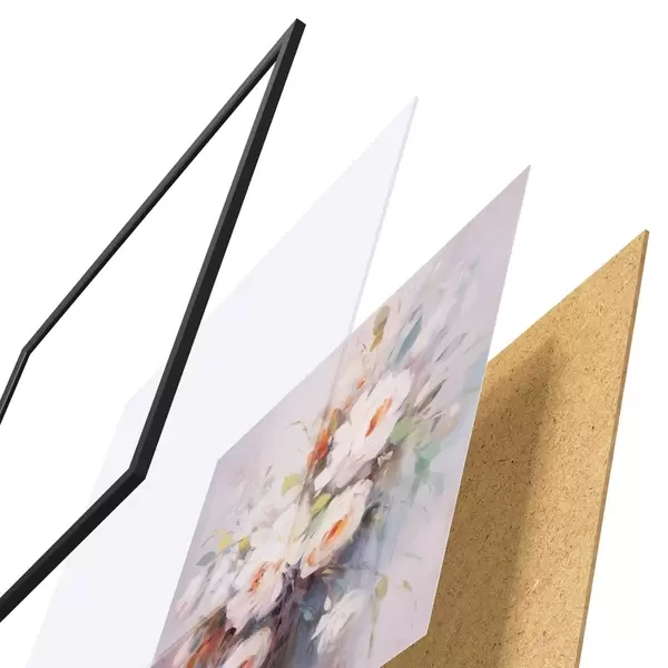 De poster bestaat uit een frame, plexiglas, geprinte afbeelding en spaanplaat achterkant. De poster kan meteen aan de muur worden gehangen dankzij de bevestigingen op de achterkant.