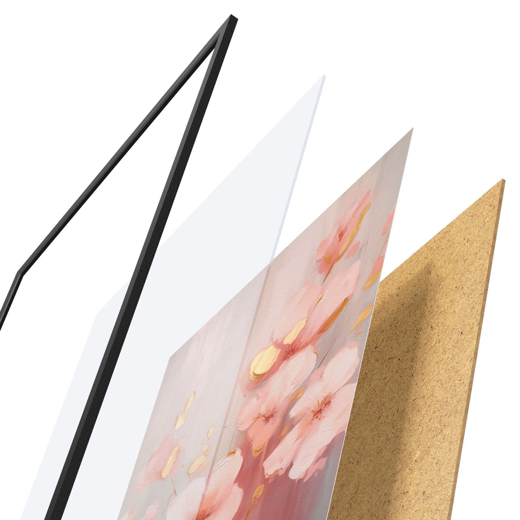 De poster bestaat uit een frame, plexiglas, geprinte afbeelding en spaanplaat achterkant. De poster kan meteen aan de muur worden gehangen dankzij de bevestigingen op de achterkant.