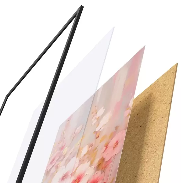De poster bestaat uit een frame, plexiglas, geprinte afbeelding en spaanplaat achterkant. De poster kan meteen aan de muur worden gehangen dankzij de bevestigingen op de achterkant.